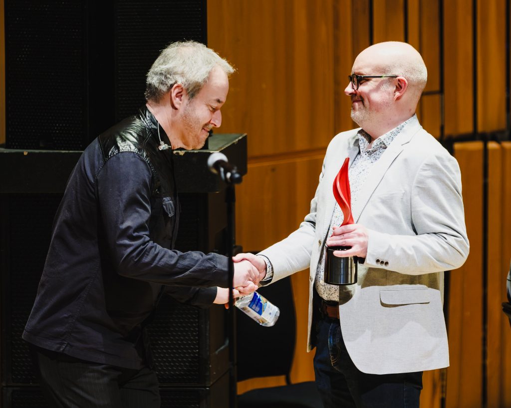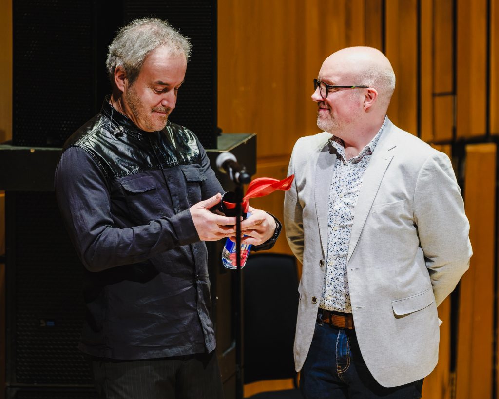 David Arnold was presented with the ‘Gunning Inspiration Award’ this evening. (9th April 2026). Named for the late composer Christopher Gunning (1944-2023), whose legacy inspired the festival, it recognises industry figures who have made a lasting impact on music with distinction and craft. The award features a distinctive red flourish, recalling the red scarf that Chris was rarely seen without.