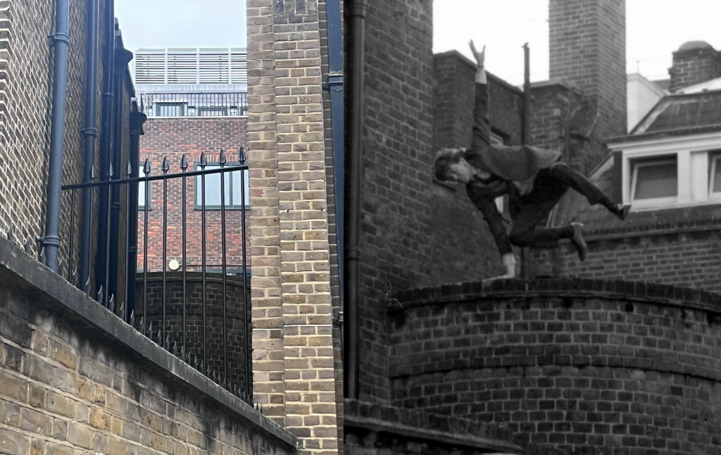 As part of the deleted chase scene, an agent of Spectre played by Brian Grellis jumps from a turreted annex found in Knightrider Court. The whole chase scene would have looked much different today with the corrugated steel railings blocking the passage.