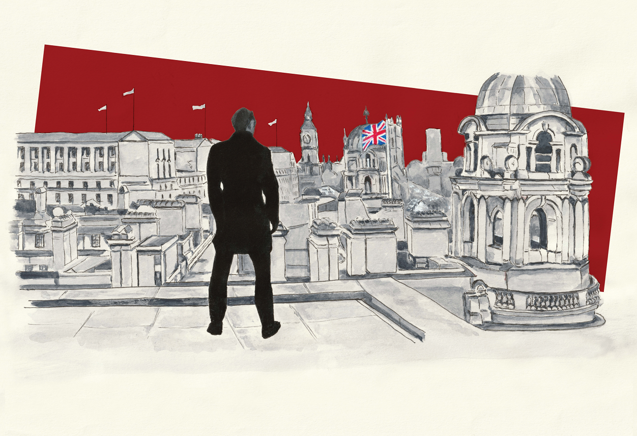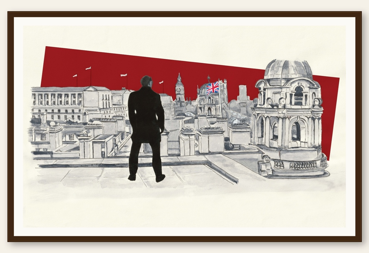 You know the scene. London spread out beneath him. The rooftops of Whitehall, the dome, the flag. A silhouetted figure — calm, unhurried, owning every inch of the view. British artist Iris Brooker has captured that moment in this original hand-painted illustration, reproduced here as a strictly limited edition of just 50 prints — the only edition ever produced in this distinctive deep crimson colourway.