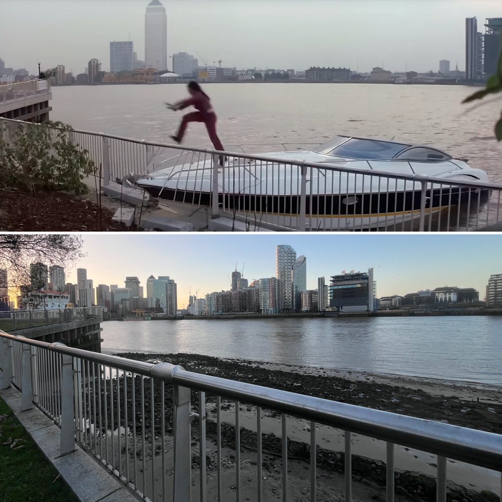 Still the next sequence does make sense at least from a geographical perspective. We are now in the Millwall Outer Docks and Cigar Girl is shooting at Bond in the Q Boat.